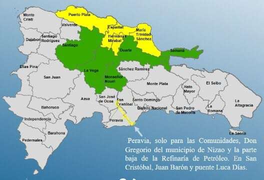 De esas 11 demarcaciones, las que están en amarilla son Peravia (especialmente las comunidades Don Gregorio del municipio Nizao y la parte baja de la Refinería de petróleo); San Cristóbal (principalmente Juan Barón y Puente Lucas Días); María Trinidad Sánchez; Puerto Plata; Espaillat y Hermanas Mirabal.