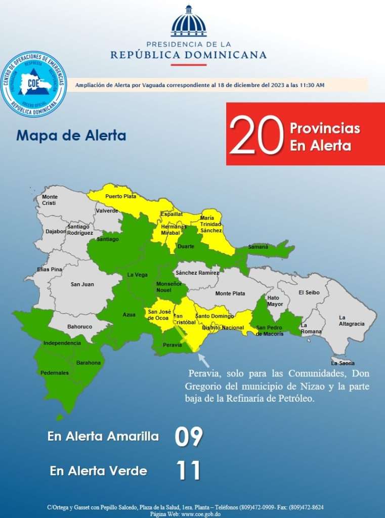 Mientras que en alerta amarilla están las comunidades Don Gregorio del municipio Nizao y la parte baja de la Refinería de petróleo, en Peravia;  María Trinidad Sánchez, Puerto Plata, Espaillat, Hermanas Mirabal, Santo Domingo,