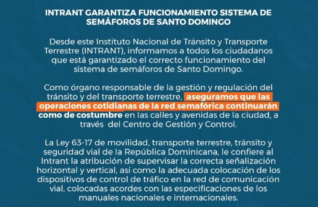 Mediante un comunicado el Intrant tranquilizó a la población sobre la situación del tráfico de este jueves, luego de las declaraciones del abogado de la empresa Transcore Latam, Carlos Balcácer, quien aseguró que detendría todos los semáforos comprados a esa empresa, debido a que el director de Compras y Contrataciones suspendió el proceso de licitación por entender que existen serias irregularidades.