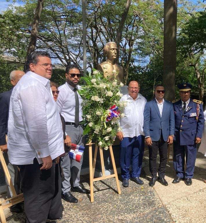 El cónsul dominicano César Cedeño, encabezó la entrega floral, junto a Melchor Matos, Director del INDEX-PR , acompañado de funcionarios de ambas instituciones y donde el Presidente del Partido Revolucionario Moderno PRM, Zacarías Madé y miembros de esa colectividad política igualmente depositaron otra ofrenda.