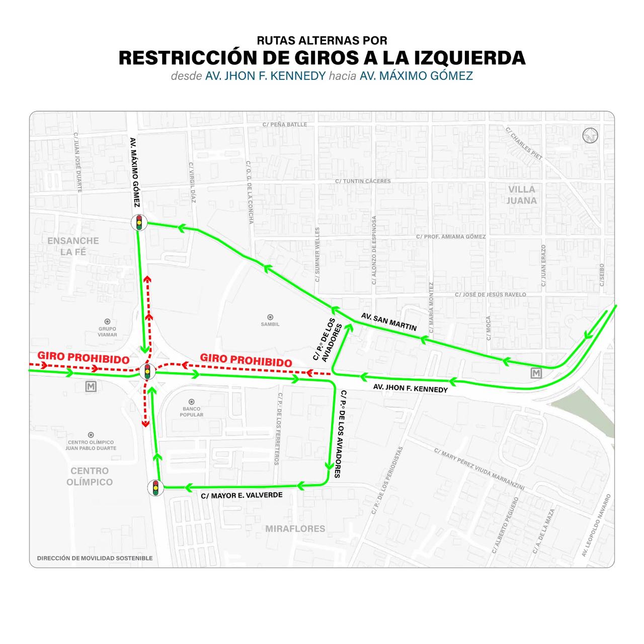 Para el giro restringido en la John F. Kennedy hacia el sur por la Máximo Gómez, los conductores podrán tomar la avenida San Martín y girar a la izquierda en la avenida Máximo Gómez, o bien utilizar la calle Paseo de los Aviadores para incorporarse a San Martín y desde allí conectar con Máximo Gómez hacia el sur.