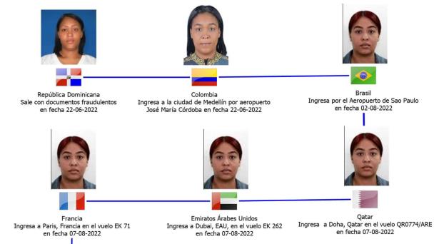 Posteriormente, el 22 de junio de 2022, la acusada abandonó el país desde el Aeropuerto Internacional de Punta Cana con destino a Medellín, Colombia, y de ahí a Brasil, utilizando un pasaporte con el nombre Denny María Rodríguez Hierro. Luego, el 6 de agosto de 2022, viajó a São Paulo, Brasil, bajo la identidad colombiana de Rina Vásquez Sarabia. Su recorrido la llevó a Qatar y Emiratos Árabes Unidos, para finalmente arribar a España, donde se reunió con su pareja sentimental.