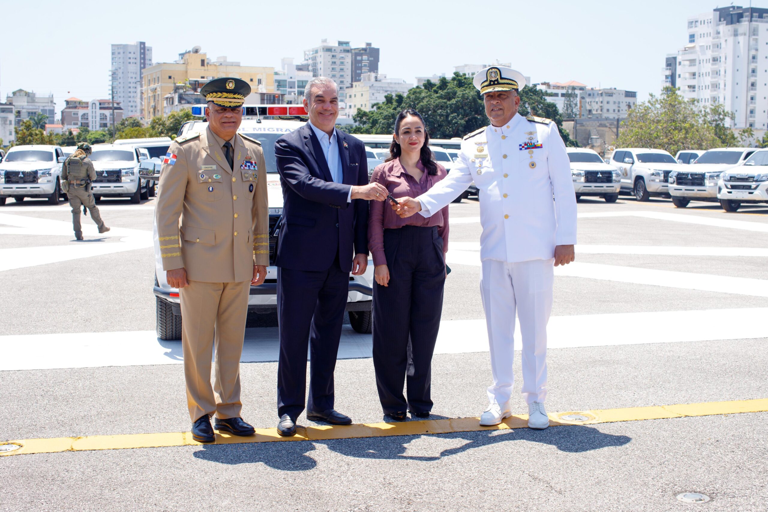 La entrega de las camionetas se realizó en el helipuerto del MIDE y las llaves fueron entregadas por el mandatario Abinader Corona al Vicealmirante Lee Ballester. Este luego entregó los vehículos al Coronel Manuel Antonio Carrasco, director de Control Migratorio de la DGM, con instrucciones de comenzar de inmediato a utilizarlas en los operativos de interdicción.
