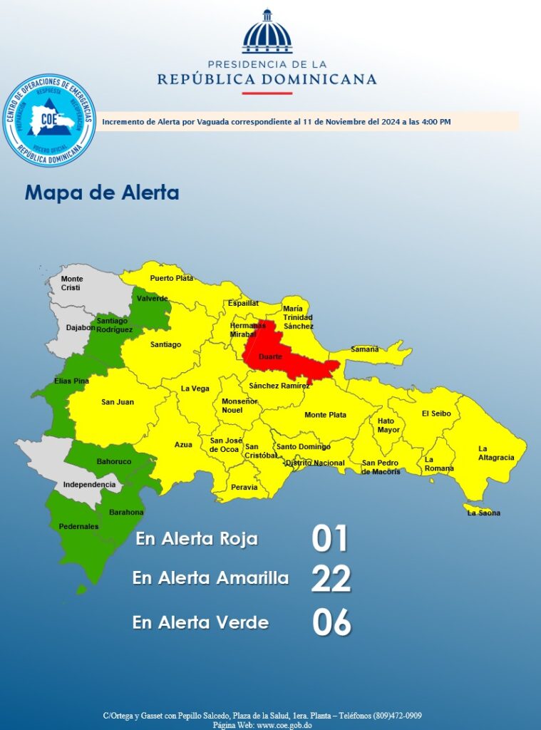El Centro de Operaciones de Emergencias incrementó los niveles de alerta en el país colocando la provincia Duarte en alerta roja.